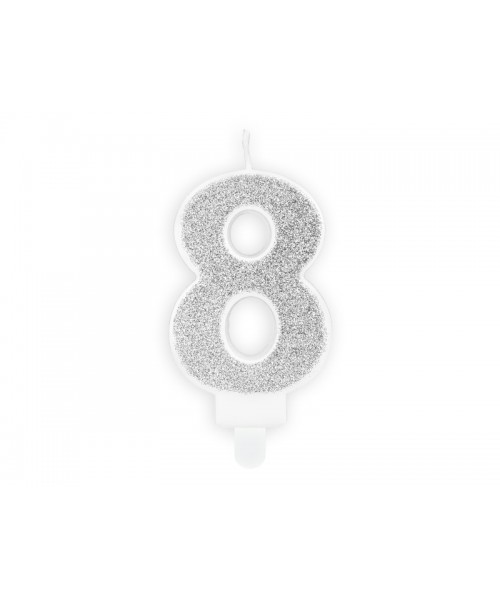 Vela con el número 8 en purpurina plata.